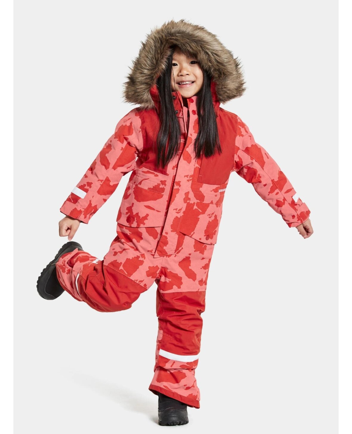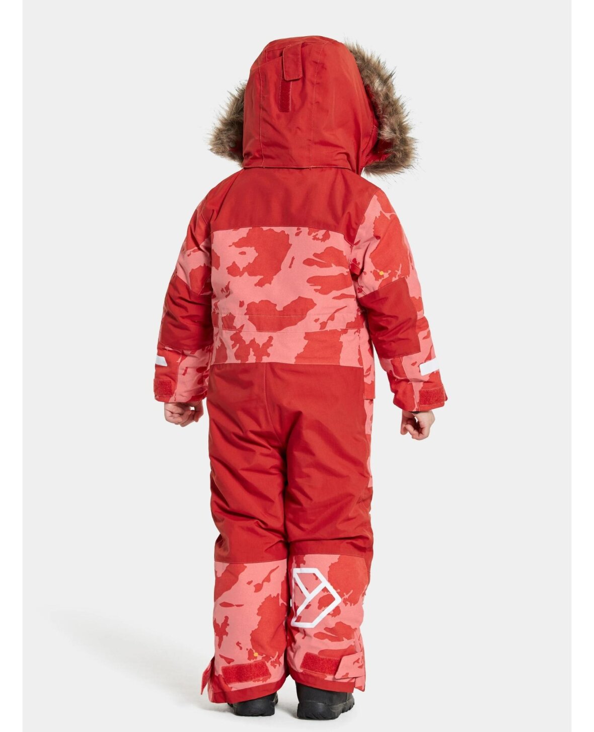 Björnen er en varm og klassisk Didriksons overall i et vindæt og vandtæt trykt stof. Den er slidstærk og åndbar og har tapede sømme. Denne overordnede har til rummelige frontlommer og en mindre brystlomme. Björnen har reflekterende detaljer på alle sider for synlighed. Hætten er justerbar, og både hætten og dens kunstpels kan tages af. Heldragten har en lynlås, der er dækket af en beskyttende stormklap midt foran. En høj krave med trykknapper og indvendige manchetter med tommelfingerhuller og en løkke til påsætning af håndsker eller vanter. Björnen har funktionen "Extend size", hvilket betyder, at ærmer og ben kan forlænges med op til en størrelse. Talje, manchetter og ankler kan alle justeres for optimal pasform. Inkluderer snegamacher og udskiftelige fodstropper. Heldragten er polstret med genanvendt polyesterfiber, og foret er farvet med Solution Dye, en farveteknik, der sparer op til 80 % vand sammenlignet med konventionelt indfarvet polyester/polyamidstof. Til den marineblå farve er skalstoffet opløsningsfarvet, for PFC-fri vandafvisende finish. Navneskilt med plads til flere navne indeni.