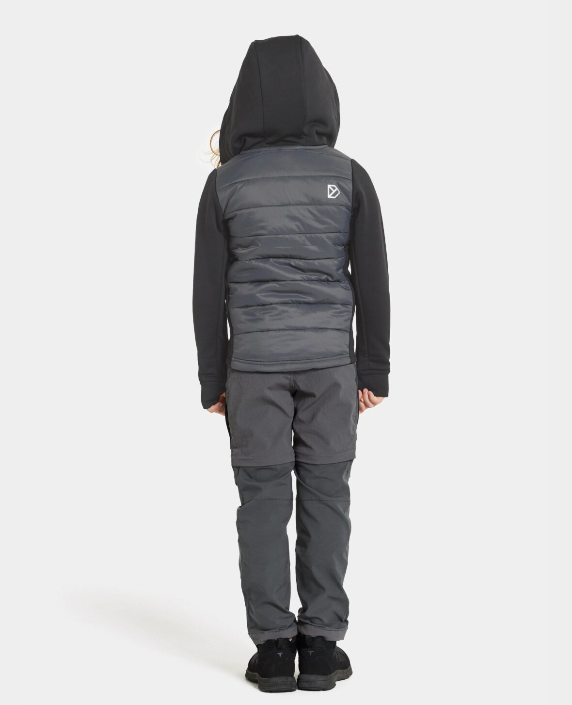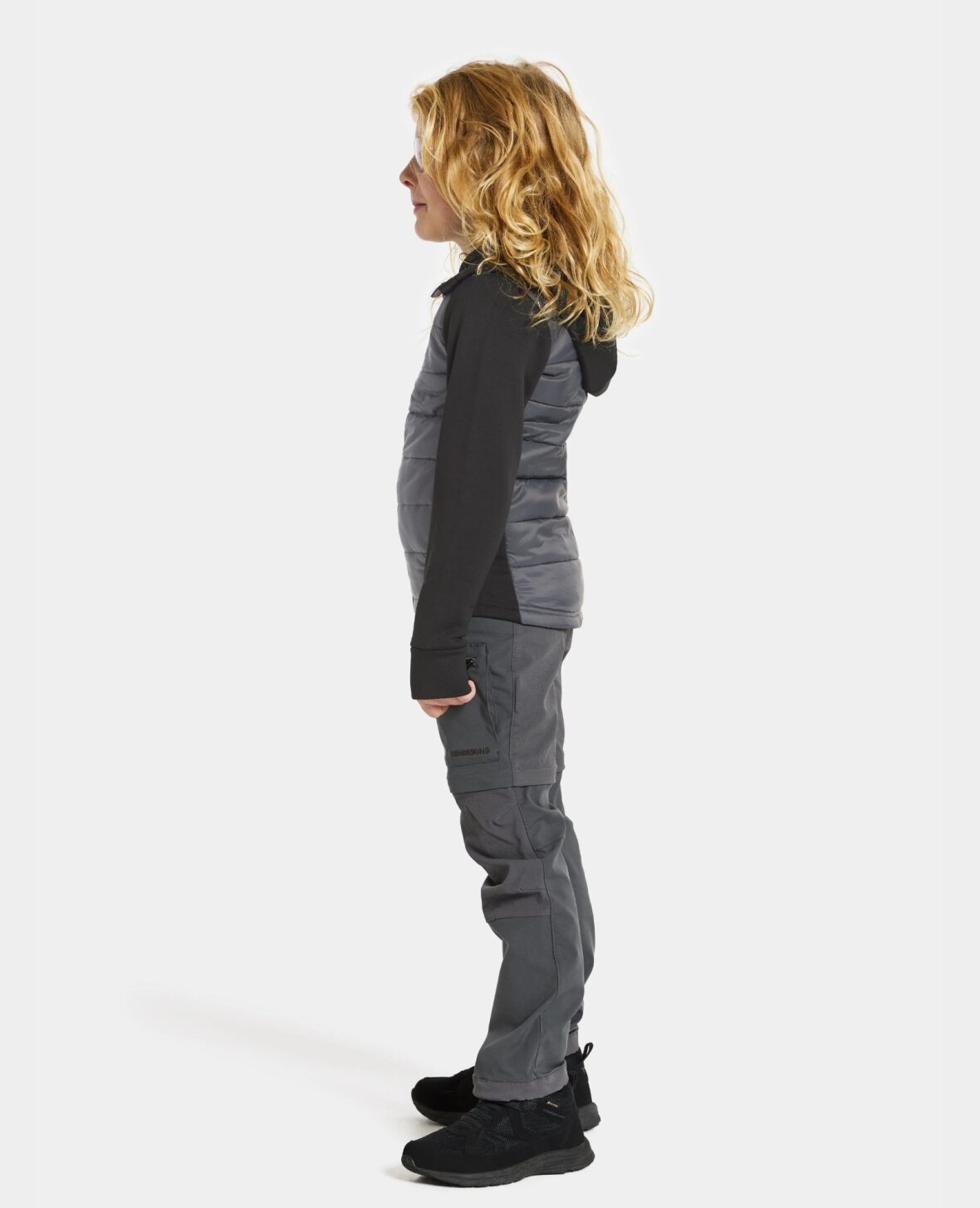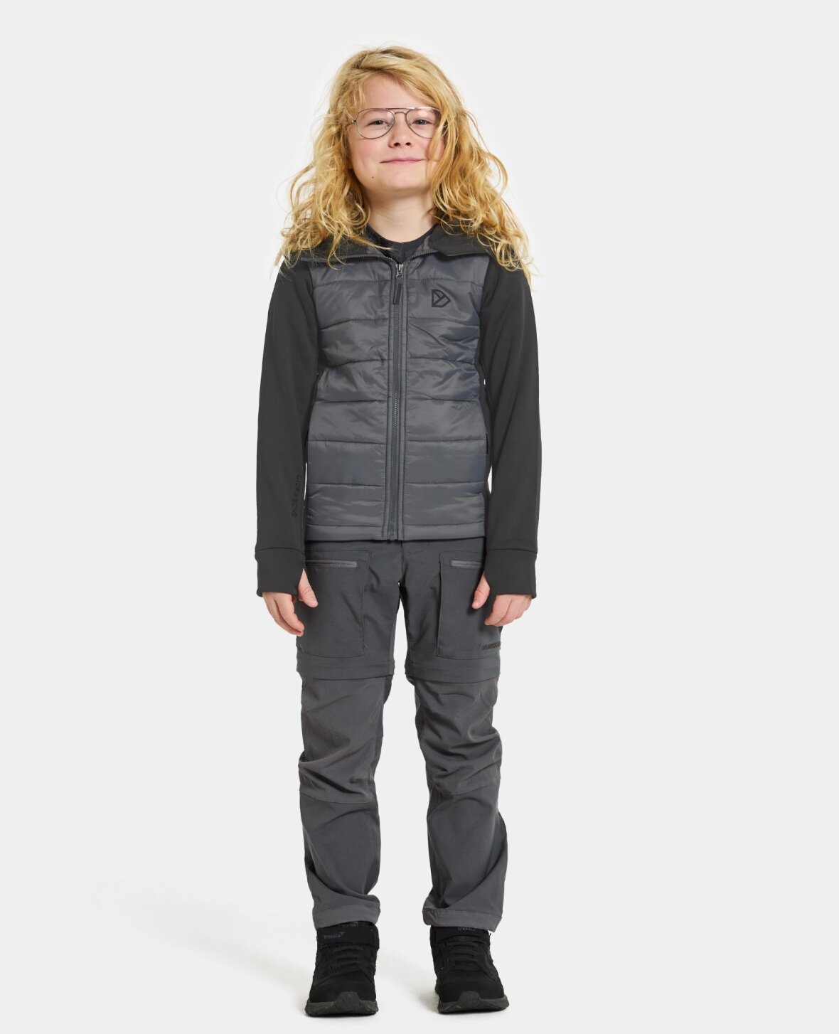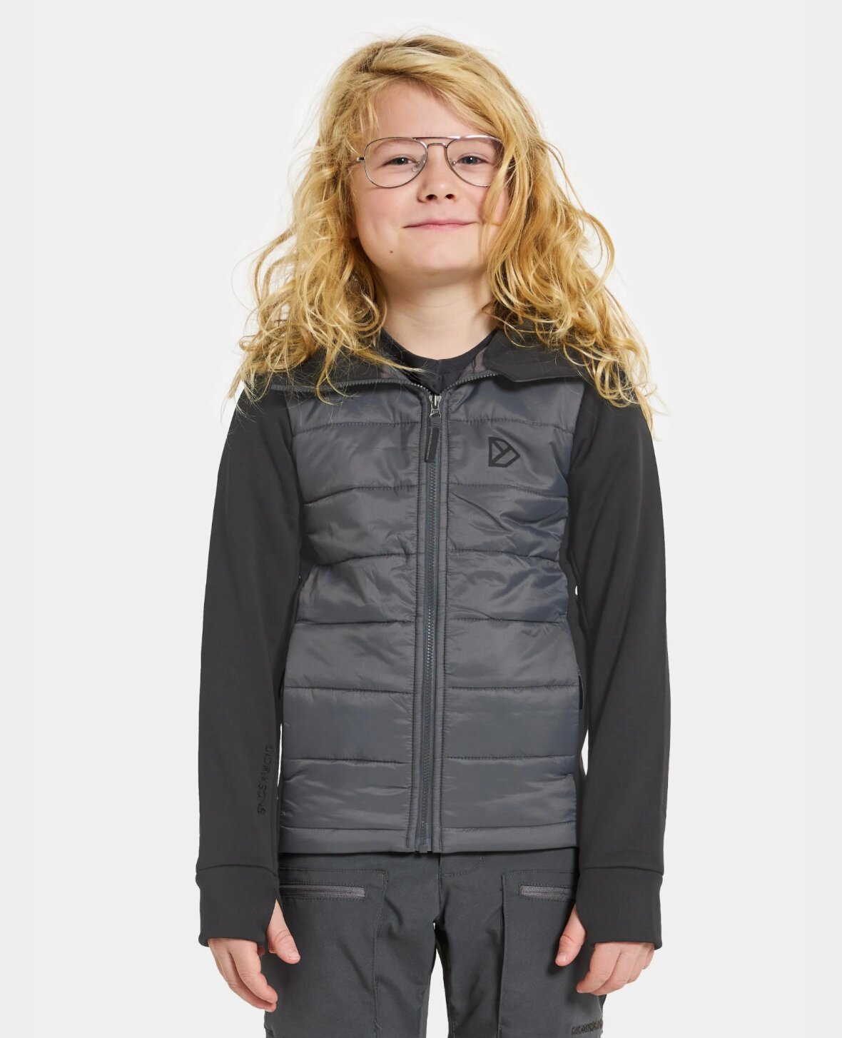 For- og bagside er quiltet og sidepaneler, arme og hætte består af et mat strikstof med flad yderside og hyggelig børstet inderside med fuld stretch.