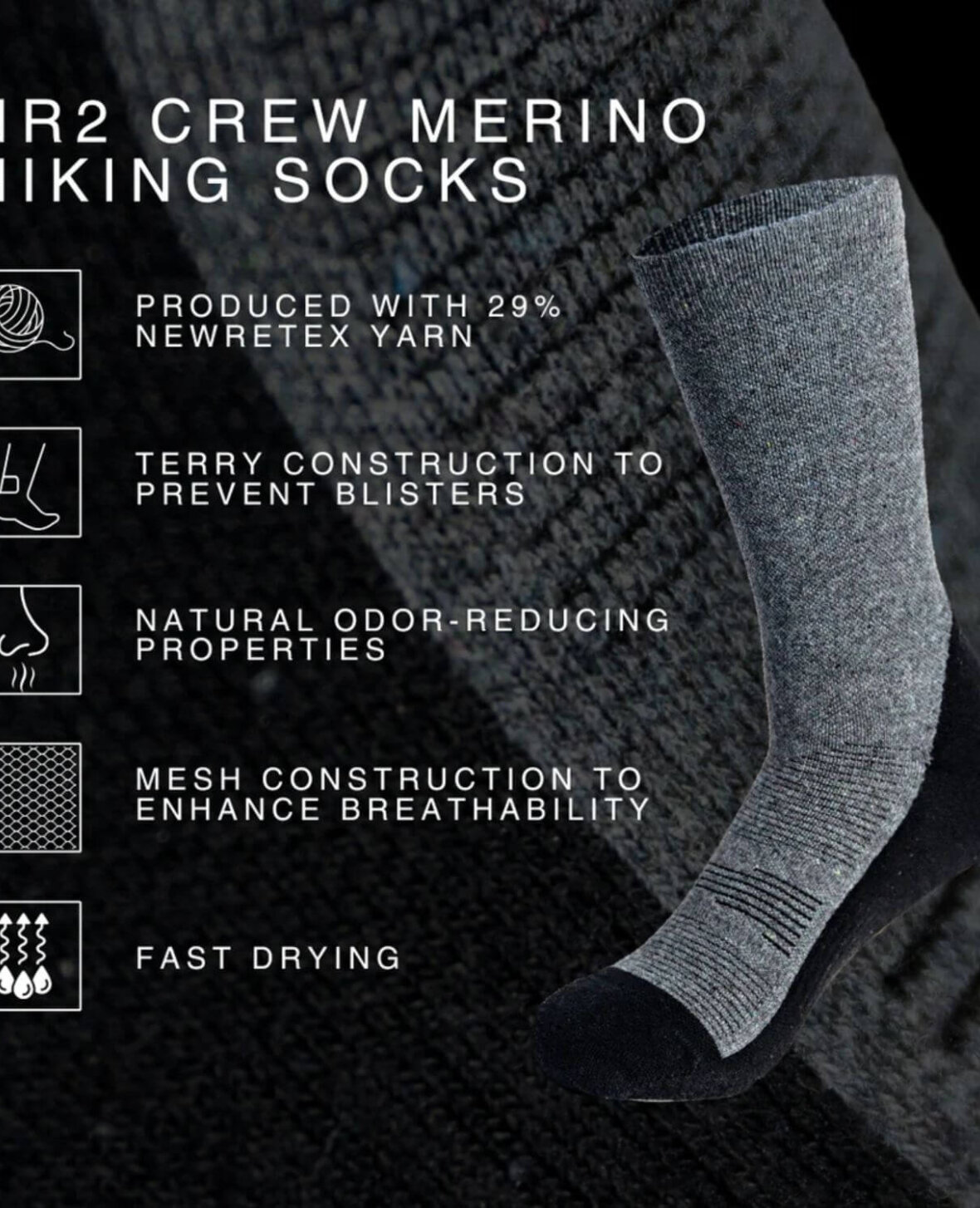 NR2 CREW MERINO HIKING SOCKS har temperaturregulerende og lugtbekæmpende egenskaber, indvendig terrykonstruktion for blødhed og beskyttelse mod vabler samt forstærket sål og elastisk svangstøtte for stabilitet på ujævnt terræn – perfekt til både krævende og afslappede vandreture.
