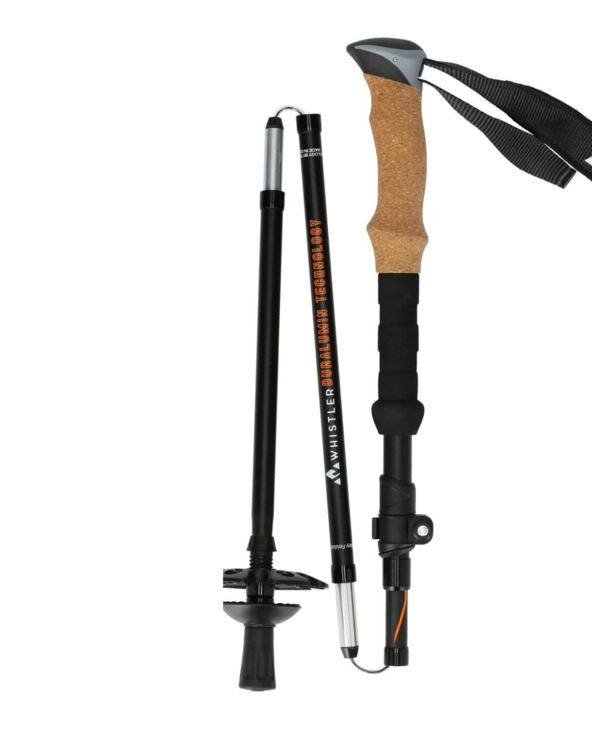 Hårdmetallspidserne sikrer et stabilt greb på underlag som grus, sten og sne, mens det ergonomiske korkhåndtag med justerbar håndledsrem giver høj komfort under længere vandringer.