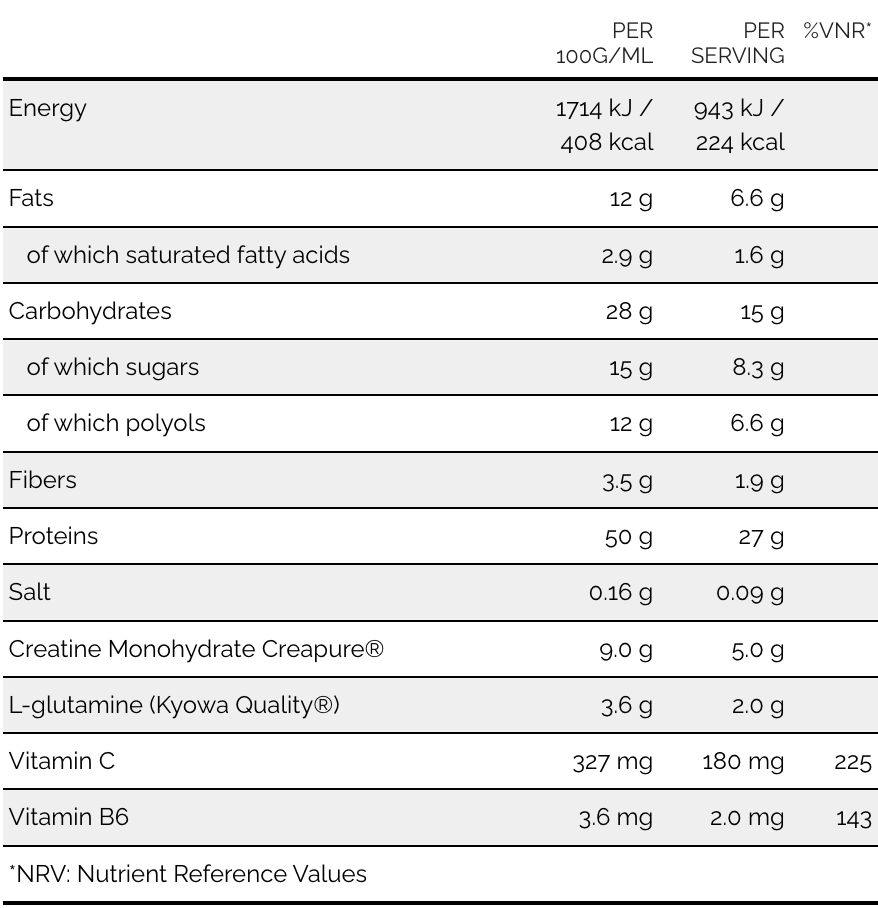INGREDIENSER: mælkeproteiner; fugtighedsbevarende middel: maltitol; kreatinmonohydrat Creapure® 9,0%; glukosesirup; solsikkeolie; fruktosesirup; frukto-oligosaccharider; sojacrumble (isoleret sojaprotein, tapiokastivelse, salt); L-glutamin (Kyowa Quality®) 3,6%; kakaosmør; chokoladepasta 3% (kakao 61%, solsikkeolie, emulgator: sojalecithin, aromaer); æggehvide; honning; emulgator: sojalecithin; glycerol; maltodextrin; kakaopulver; aromaer; C-vitamin (L-ascorbinsyre); konserveringsmiddel: kaliumsorbat; fortykningsmiddel: guarmel; antioxidant: alfa-tocopherol; vitamin B6 (pyridoxinhydrochlorid). Kan indeholde jordnødder og nødder. GLUTENFRI.