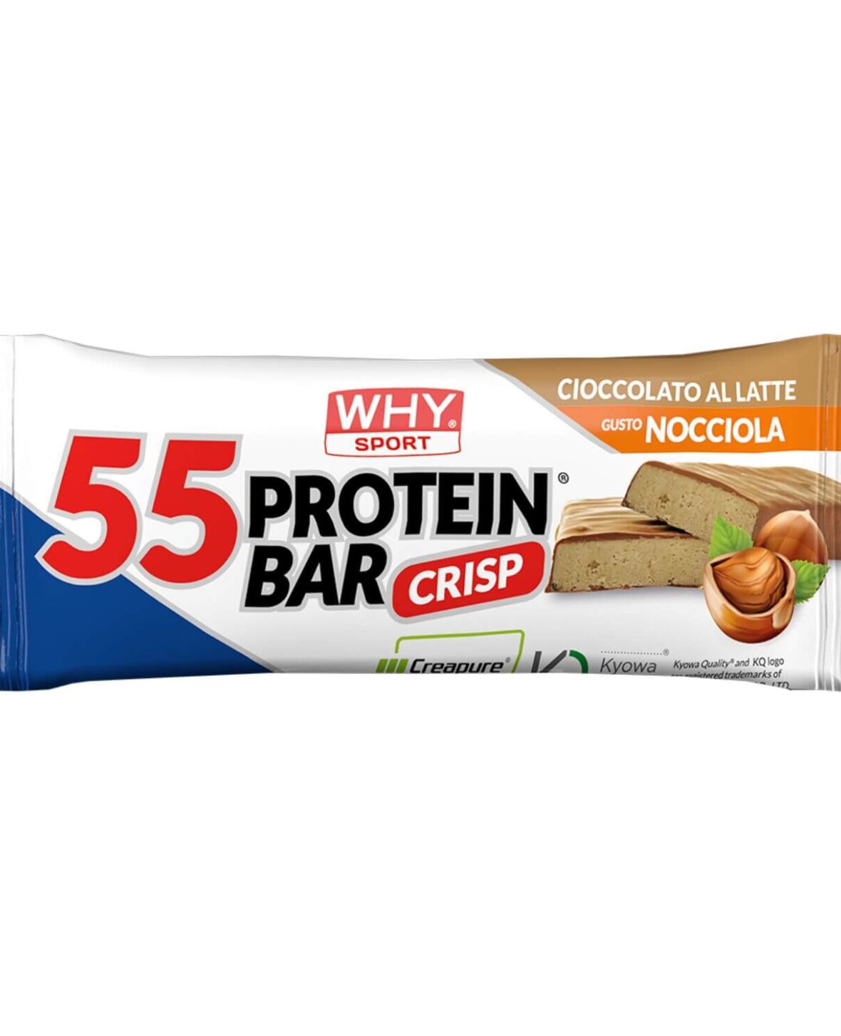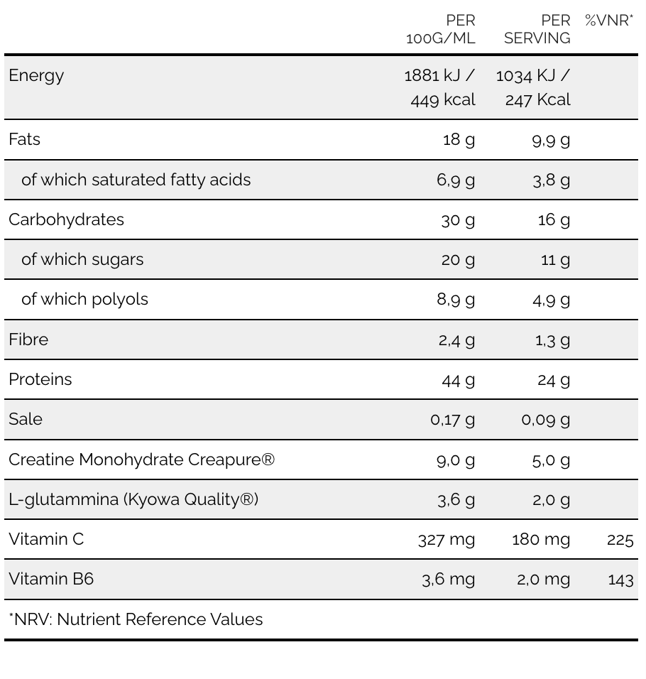 INGREDIENSER: mælkeproteiner; mælkechokoladeovertræk 14,5% (sukker, sødmælkspulver, kakaosmør, kakaomasse, emulgator: sojalecithin, naturlig vaniljearoma); fugtighedsbevarende middel: maltitol; kreatinmonohydrat Creapure® 9,0%; glukosesirup; fruktosesirup; kakaosmør; solsikkeolie; sojasprødhed (isoleret sojaprotein, tapiokastivelse, salt); L-glutamin (Kyowa Quality®) 3,6%; fructooligosaccharider; hasselnøddesmagspasta 4% (hasselnødder, sukker, fedtfattigt kakaopulver, kakaopulver, solsikkeolie, stivelse, aromaer); æggehvide; hakkede hasselnødder 1,5%; honning; emulgator: sojalecithin; glycerol; maltodextrin; aromaer; C-vitamin (L-ascorbinsyre); konserveringsmiddel: kaliumsorbat; fortykningsmiddel: guarmel; antioxidant: alfa-tocopherol; vitamin B6 (pyridoxinhydrochlorid). Kan indeholde jordnødder og andre nødder. GLUTENFRI.