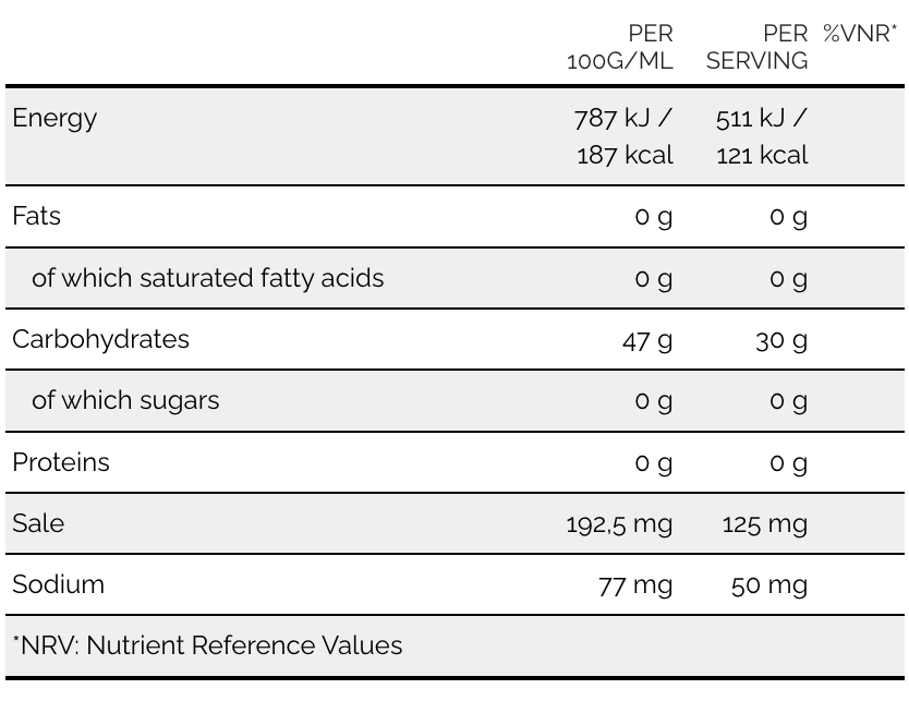 Energigel baseret på maltodextrin, cyclodextrin og natrium, med sødemiddel.